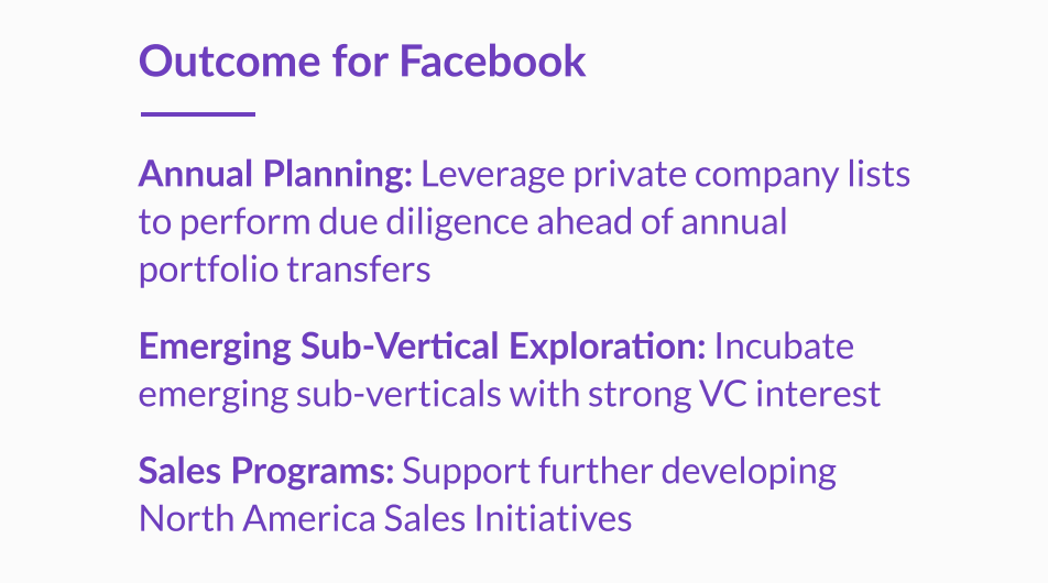As a result, Facebook was able to leverage private company lists to perform due diligence ahead of annual portfolio transfers, incubate emerging sub-verticals with strong VC interest, and support developing North America Sales initiatives to expand their client coverage and accelerate their revenue growth.